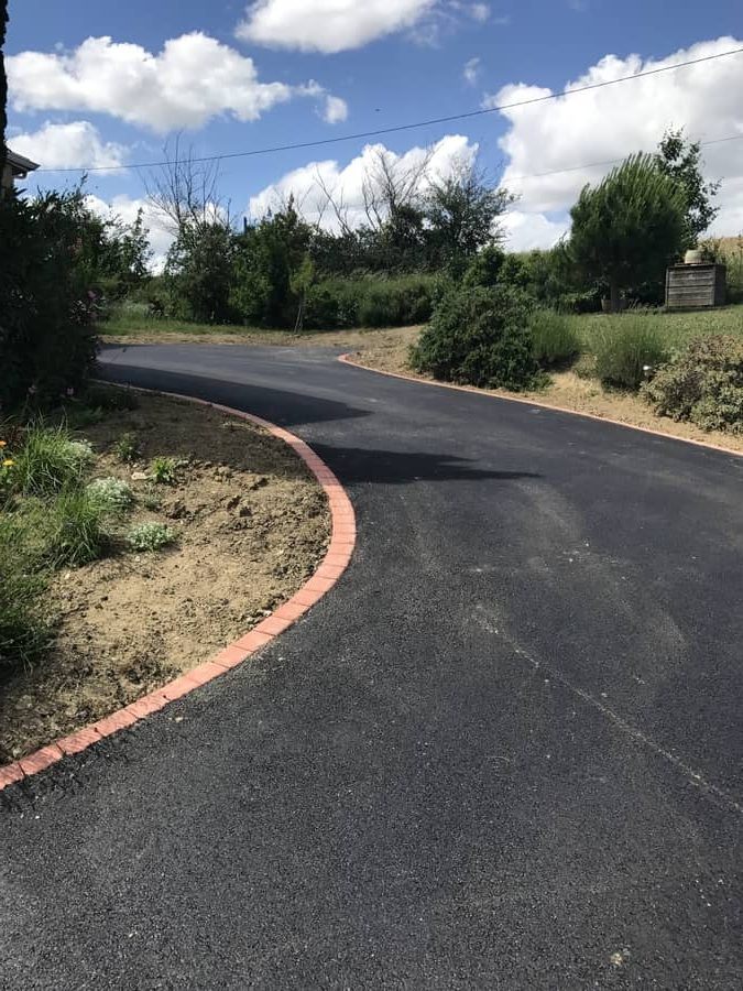 Réalisation de revêtements de goudronnage à base d’émulsion à chaud sur des chemins, des cours de ferme, des parkings et des accès divers avec une finition en gravier ocre, blanc ou gris.